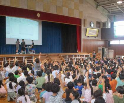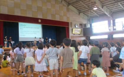 今日は、全校集会で委員会の発表を聞いたり、○×ゲームに参加したりしました。○×ゲームでは、各学年が題材となった問題が出題されており、○なら立つ、×なら座るというルールで身体を動かしながら楽しめる活動になっていました。子供たちは問題を通して他学年のことを知ることができ、喜んでいました。