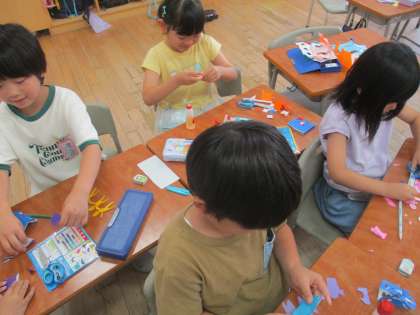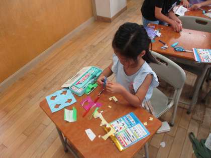 今日は、折り紙とはさみを使って飾りをつくりました。子供たちは、いろいろな形になるように切り方を考え、下書きを書いてから切るなど工夫していました。