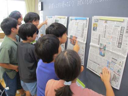 社会科では、家庭で出るごみをどのように分別するか、班の友達と話し合いながら、分別のシミュレーションをしました。考えていた以上にリサイクルごみが多いことに気付き、驚いていました。また、国語科では実際の新聞に触れ、今どのようなことが話題となっているのか読み取っていました。