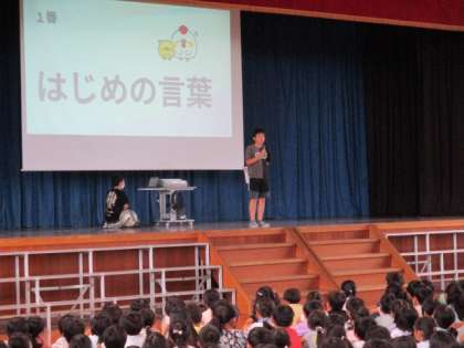 全校集会では、委員会のお知らせやゲーム、全校合唱等を行います。