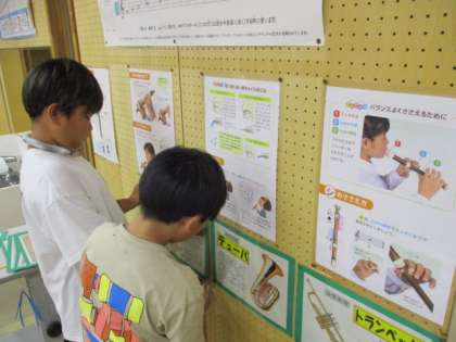 音楽室掃除を担当している4年生は、ごみを集めることだけでなく、「音楽室を使う人がどうすれば使いやすくなるか」と考え始めていました。しかし、毎日の清掃時間では、ごみを集めたり、机や椅子の整頓で時間が終わっていました。すると、次の日、マイタイムや休み時間に「音楽室の整頓の続きをしていいですか」と言いに来る子が現われました。様子を見に行くと、楽器の置き場所をテープで示したり、音楽に関する掲示物を貼ったりしていました。作業しながら、「どうする?」「もっとこうしたらいいよ」と少しでもよくなるように力を合わせて取り組んでいました。それでも時間が足りなかったようで、「また来ます」と話す表情は、休み時間に遊んでいたかのような満足感に満ちた素敵な笑顔でした。