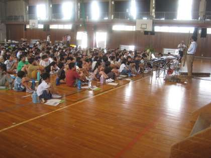 総合的な学習の時間に、竹を伐採したり、竹細工をしたりしている方に来ていただき、お話を聞いたり活動をしたりしました。竹と環境問題のつながりについてクイズや絵本で楽しく教えていただきました。また、クラスごとに竹灯籠をつくらせていただきました。子供たちは、初めて触るドリルに緊張しながら、竹灯籠の仕上がりを楽しみにしている様子でした。