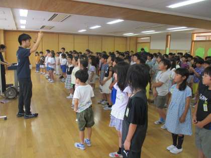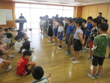 各クラスで練習していた「グッドモーニング」という曲を初めて学年で合わせて歌ってみました。静かな朝の様子を思い浮かべながら歌っています。ソプラノとアルトに分かれている部分もあるので、それぞれの音を聞きながらきれいなハーモニーになるようにがんばって練習していきます。