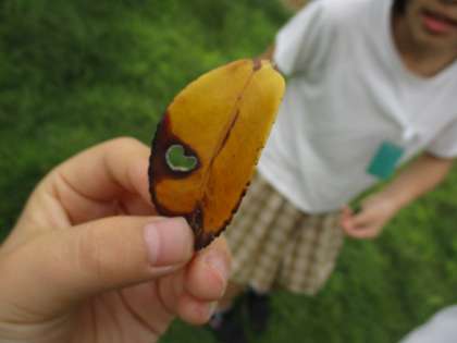葉を使って作品を作ります。今日は、校庭でお気に入りの葉を探しました。
