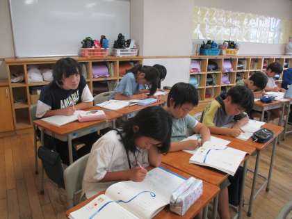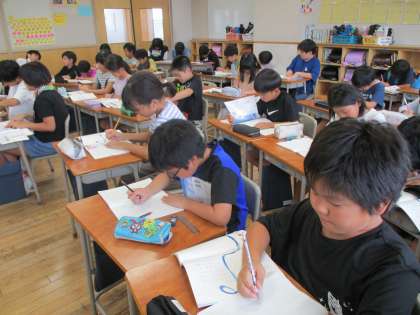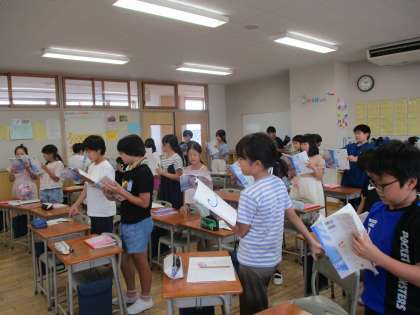 2学期最初の国語の授業では、坂田寛夫さんの「ぼくは川」という詩を学習しました。「ぼく」を「川」とみる読み方、「ぼく」を「川にたとえた自分」とみる読み方でそれぞれどのような印象をもったか話合いました。また、それぞれどのような風景が目に浮かんだか、絵で表しました。音読を通して、詩の面白さに気付きました。