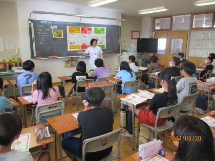給食の献立の工夫をみんなで考えました。栄養教諭の四十万先生にも教室に来ていただき、献立をつくるときの工夫や気を付けていることを教えてもらいました。