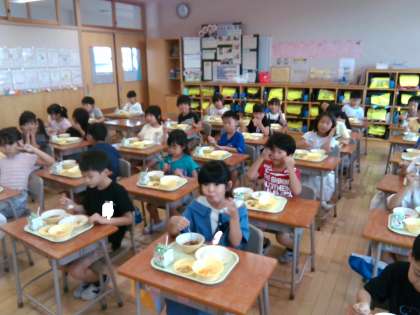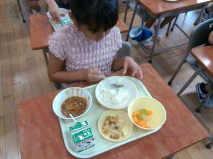 今日の給食はカレーライスでした。子供たちは大好きなメニューを残さないように味わって食べていました。