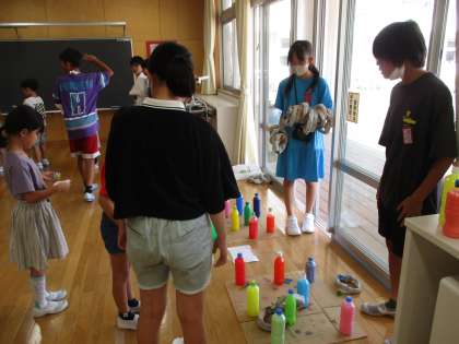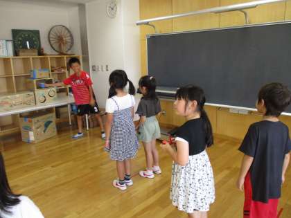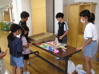 学級活動の時間に、「1年生とふれあい、なかよくなりたい」という思いから、1年生が楽しく遊ぶことができるような企画を考えました。9月4日から6日間、「なかよしまつり」を行う予定で、準備を進めてきました。今日は第1回目で、1年生に楽しんでもらおうと、優しく声をかける様子が見られました。