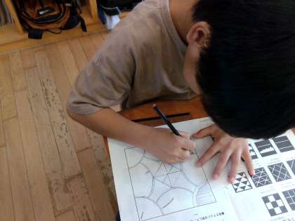 一つの板を角度や位置を変えて刷ることで、連続模様や不思議な形を生み出す「一版連結版画」に挑戦しています。下書きではいろいろな模様を描き、完成のイメージを膨らませています。