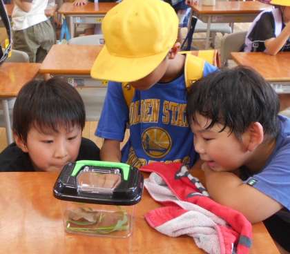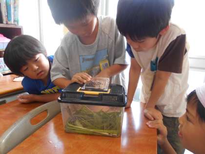 教室に戻ると、捕まえた生き物をじっと見て観察していました。「えさは何をあげたらいいかな」「草を増やした方がいいかもしれない」等とお世話の仕方を考えていました。
