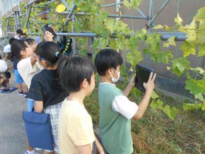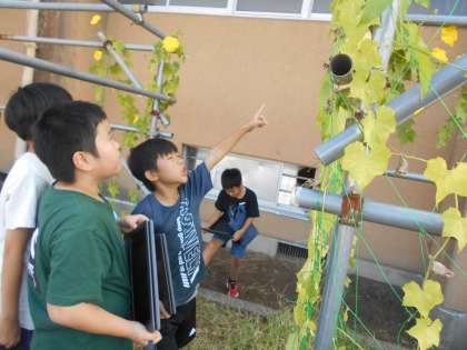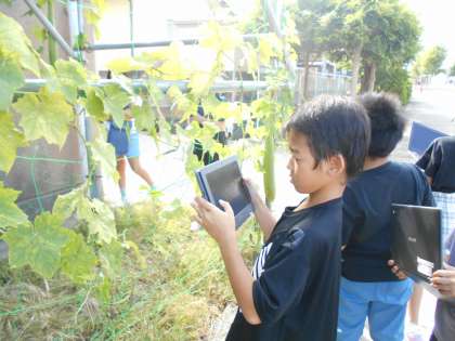今日は、理科の学習で「ヘチマの観察」をしました。夏休みの間に、大きく育ったヘチマの花や実をクロムブックで撮影し、ワークシートに観察記録をかきました。