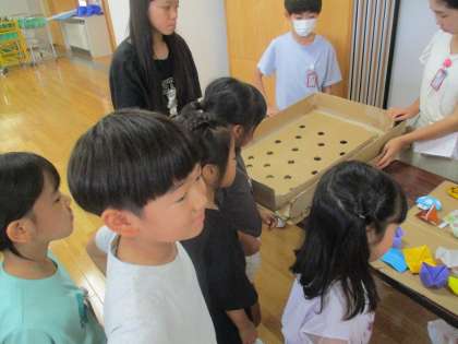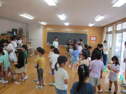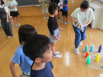 4組も6年生さんに招待していただいた「なかよしまつり」に参加しました。祭りでは、輪投げやボール投げ等のゲームを楽しみました。ゲーム終了後、素敵な参加賞をいただいて、とても喜んでいました。祭りを通して6年生さんと仲を深めることができました。