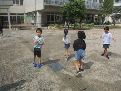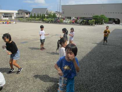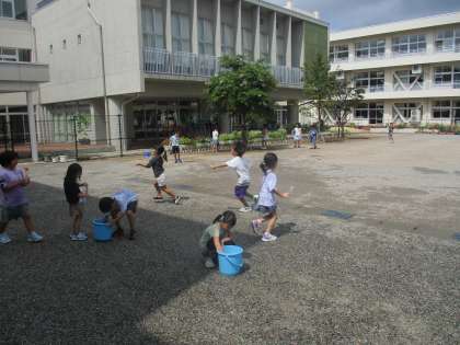 今日は、サブコートで水を使った学習を行いました。子供たちは、ペットボトルを使って水を地面にかけたり、友達同士でかけ合ったりして楽しんでいました。