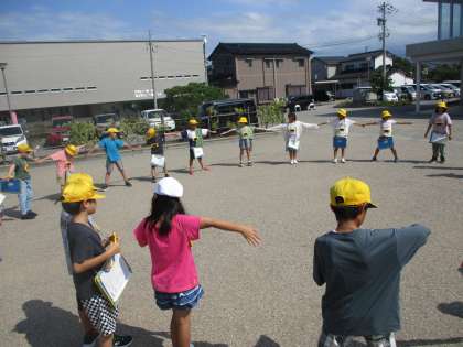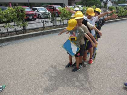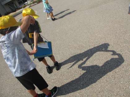 理科では太陽とかげの学習が始まりました。外でかげつなぎをする中で、「かげは太陽と関係があるのかな」「人や物があるとかげができるよ」など、様々なことに気付いていました。