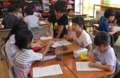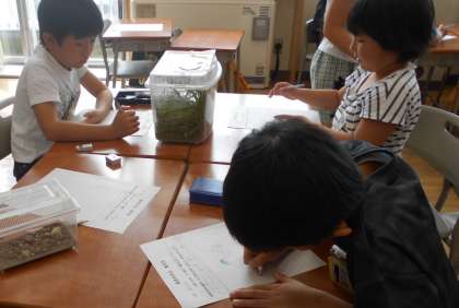 生活科の学習では、捕まえた生き物の体や動きに注目して観察カードを書きました。友達と見合いながら、生き物の特徴を見付けて記録しました。
