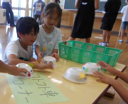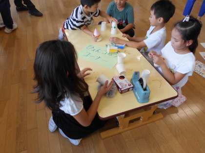 生活科の学習で、動くおもちゃで遊びました。友達と、遊び方を話し合いながら、楽しく活動しました。遊んだ後の話合いでは、「私たちもおもちゃを作りたい」「1年生に見せたい」「こわれないようにしたい」等といろいろな考えが出てきました。