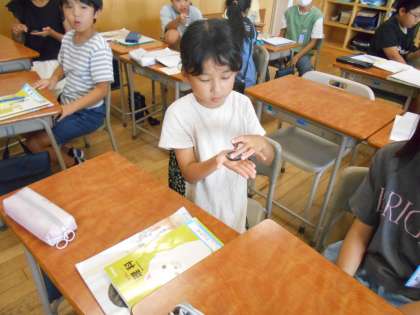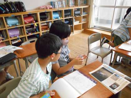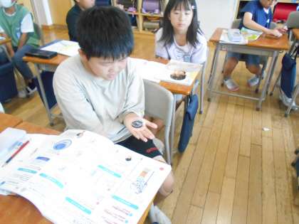 理科の学習では、月の観察を行っています。方角を調べるためには「方位磁針」が必要です。今日は、実際に方位磁針を使って方角を調べ、正しい使い方を理解することができました。