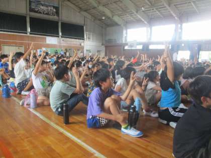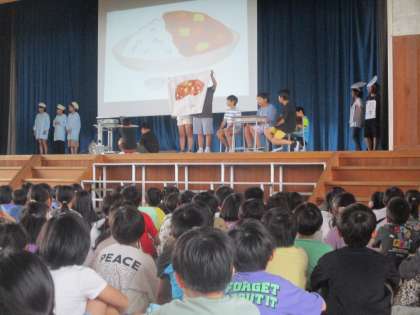 全校集会では、委員会からのクイズや劇など様々な出し物がありました。子供たちは楽しそうに活動していました。