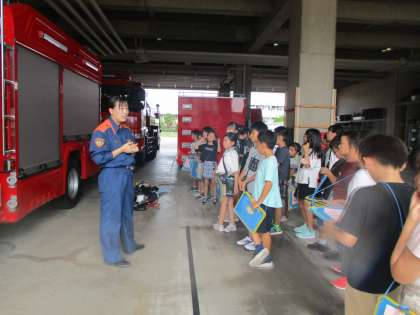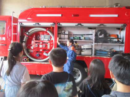 富山市消防局では、タンク車や救急車の車両、通信指令室の中を見学させていただきました。実際に出動する瞬間を見ることができ、消防局での緊迫した空気を味わいました。