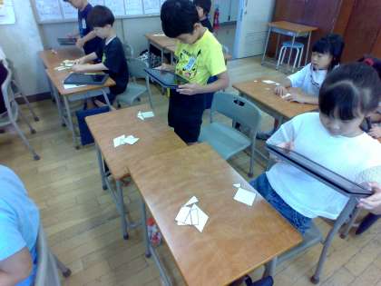 算数科では、三角形や四角形を組み合わせて、いろいろな形を作りました。作った形をクロムブックで撮影し、クラスのみんなで見合いました。「こんな形もあるのか!」「わたしも作ってみよう」と進んで楽しく学習していました。
