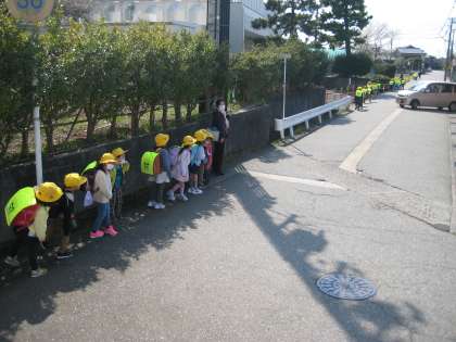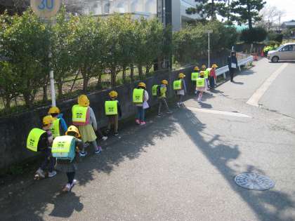 一年生は学年で色別下校を実施しています。交通安全に気をつけながら、一生懸命に歩いて下校しました。