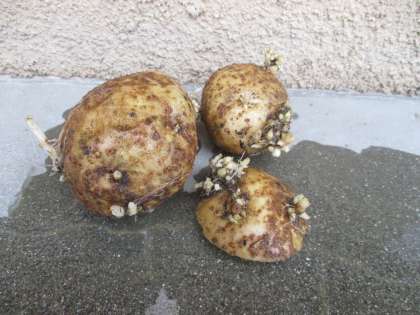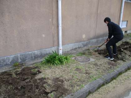 6年生の先生たちは、今じゃがいもを植える畑を作っているところです。じゃがいもは「たねいも」と言って、芽が出たじゃがいもを植えて育てます。