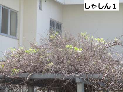 「しゃしん1」は きゅうしょくしつよこのまどからみた ふじだなの しゃしんです。