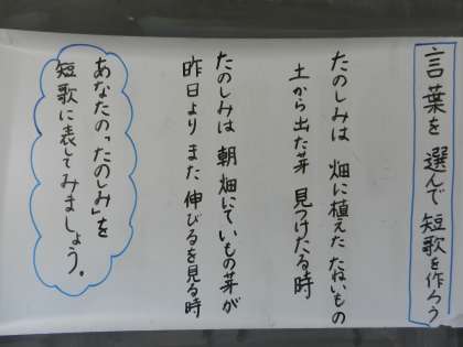 そこで、国語60ページにある「たのしみは」を参考にして短歌を作ってみました。同じ場面で二つ作りました。いろいろな表現の仕方がありますね。