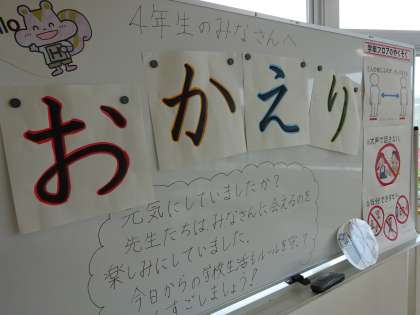 久しぶりに登校できた子供たちは、早速、黒板の掲示を見ながら、新たな学校の生活様式について学び、マスク着用、手洗い徹底、友達と距離をとって過ごすなど、約束事をきちんと守って過ごそうと意識を高めていました。