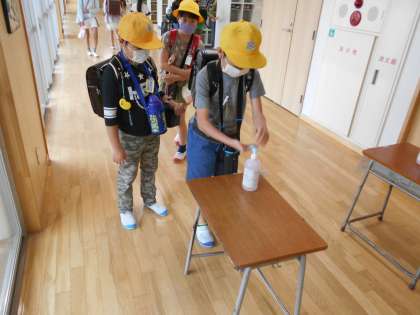 本日は、Bグループの登校でした。 校舎に入る際も、密を避けるために順番を守って入校しています。また、ウイルス除去のために、教室に入る前に、手指の消毒を行います。