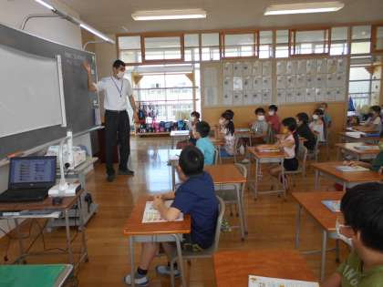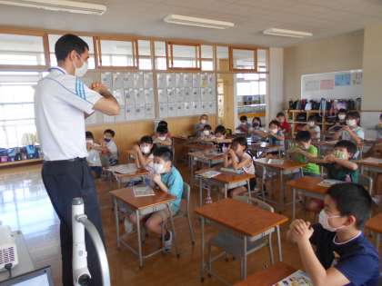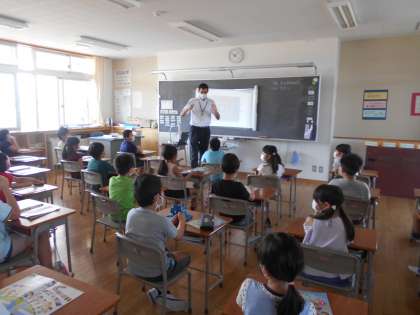 今日は、初めての外国語の勉強でした。ALTの先生の楽しい話に子供たちはすっかり引き込まれ、生き生きと取り組みました。