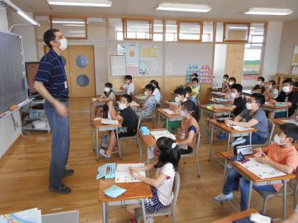 今学期に入って初めての外国語活動でした。先生の発音をよく聞いて、同じ発音になるように気を付けて発音しました。好きなものの言い方を学び、とても喜んでいました。