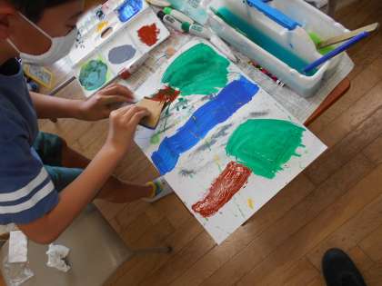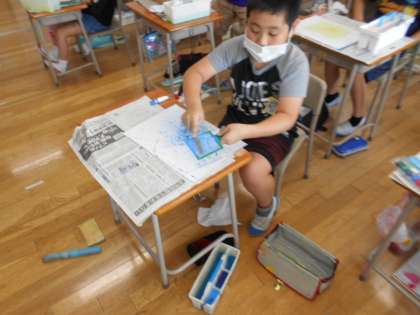 水彩絵の具で様々な模様を作る技法を学びました。ブラシと網でスパッタリングをしたり、段ボールでスタンプを作ったり、絵の具を付けたビー玉を転がしたりするなど、技法を組み合わせ、自分の好きな模様を画用紙に表しました。