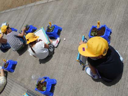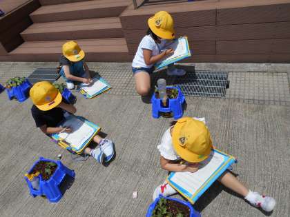 生活科「わたしのあさがお」で、あさがおの観察をしました。葉をよく見たり、触ったりして観察していると「ざらざらしているよ」や「つるつるしたよ」と発見を喜ぶ声がたくさん聞こえました。