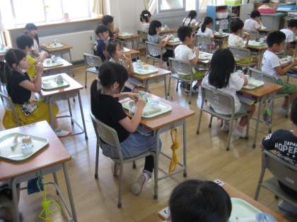 簡易給食が始まりました。前を向いて、静かにいただきました。子供たちは、久しぶりの給食をうれしそうに食べていました。