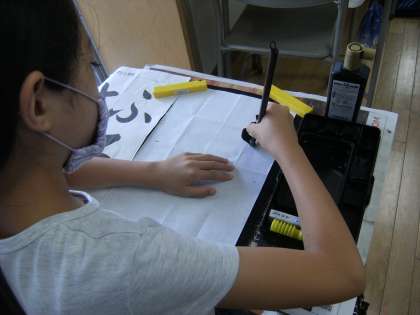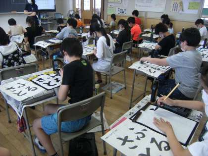 「ふるさと」という字の練習に取り組んでいます。点画のつながりを意識して筆を運び、1枚1枚丁寧に書き上げました。