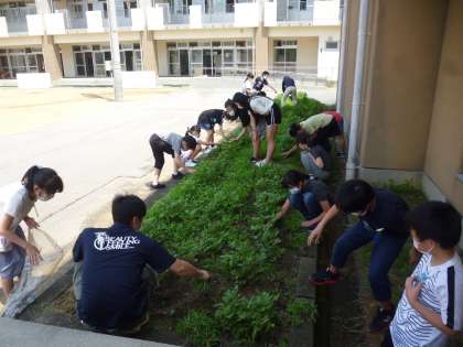 今日はリラックスタイムに、6年生の有志の子供たちと草むしりをしました。わずか10分間の活動でしたが、一生懸命に取り組み、ビニール袋いっぱいの草を取ることができました。虫に驚いたり、ジャガイモの花を観察したりしながら、楽しく活動する姿が見られました。