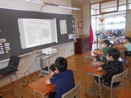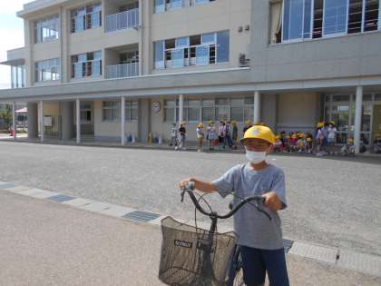 昨日の大雨で実施が心配されましたが、今日は晴天に恵まれ、無事に自転車教室を行うことができました。まず、各教室で交通安全についてのDVDを視聴し、交通ルールについて学びました。その後、一般道路に見立てたサブコートに移動し、自転車に乗るときの注意事項について実際に自転車を操作しながら学習しました。