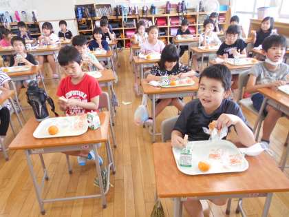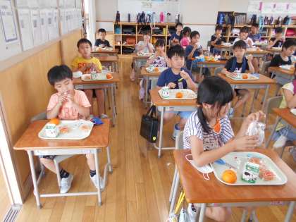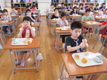 簡易給食が続いています。子供たちは約束を守って、静かに食べています。