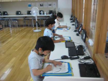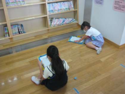 今日は、もう一度行ってみたい特別教室への学校探検行いました。図書室では、たくさんの種類の本があることに気付いていました。コンピュータ室では、パソコンが何台あるのか数えている子供がいました。子供たちは、見付けたことを発見カードに熱心に書いていました。
