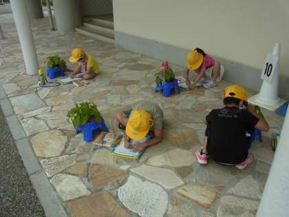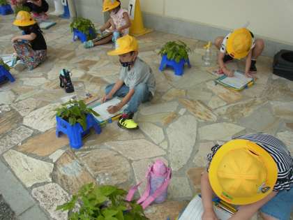 5月下旬に種を蒔いたあさがおが、どんどん成長しています。子供たちは、大きくなった葉の様子をよく見たり、触って感触を確かめたりしながら、発見したことをカードに記録しました。これからの成長を楽しみにしている子供たちです。