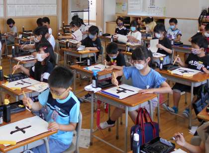 前回の学習「横画」に加えて、「たて画」も意識し、「土」の字に生かせるよう取り組みました。