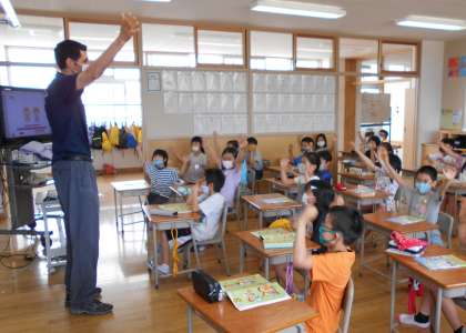 ALTの先生の発音を、関心をもって聞いている子供たちです。