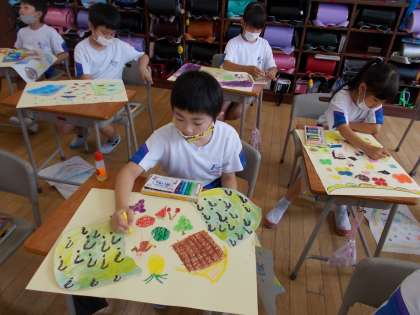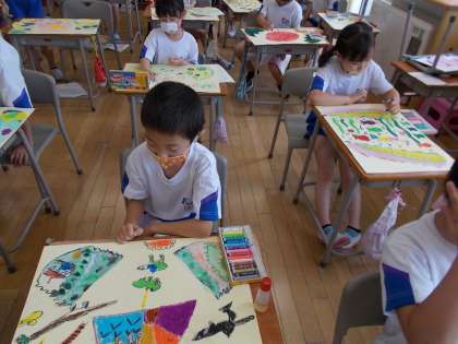 生き物や恐竜が跳びまわる世界、学校や地下や音楽の世界等、自分だけの世界を豊かに想像して、紙いっぱいに表現しました。描きながらどんどん楽しくなり、没頭して取り組む子供たちでした。