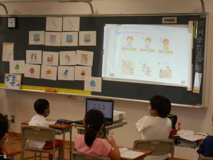 外国語活動では、天気や衣服の英語を学習しました。デジタル教科書の発音をよく聞いて、真似をして発音しました。