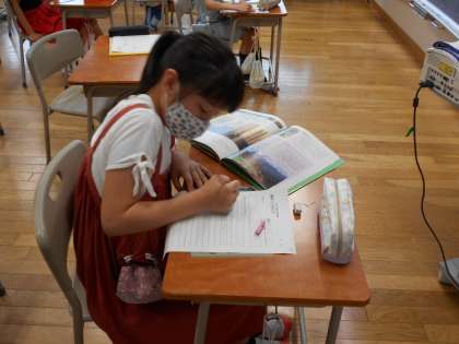 総合的な学習の時間では、環境について、自分のテーマに沿って資料をもとにして調べ学習をしています。調べ学習が進むほど、様々なことに興味が広がっています。