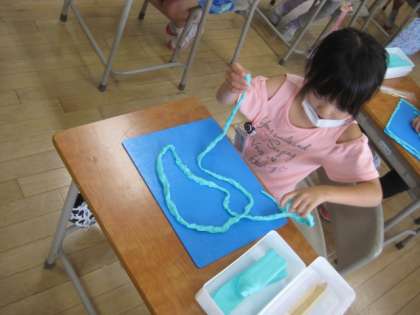 今日の図画工作は、粘土を使いました。ひもを作った後、そのひもを使ってヘビや迷路の形を作って、楽しみました。