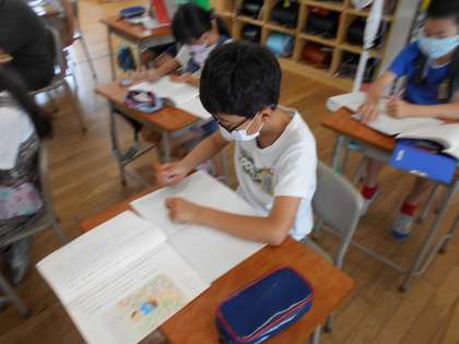 国語科「一つの花」の学習をしています。今日は、じっくりと物語を読んで、初発の感想を書きました。みんな真剣な表情で書いていました。