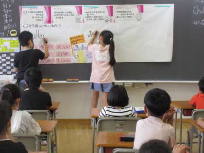 学校が再開してから1か月経ちました。今日は、学級として目指す姿を考え、学級目標を決めました。学級代表が全員の前で学級目標を書き、目標に向かってみんなで頑張ろうと意気込みました。