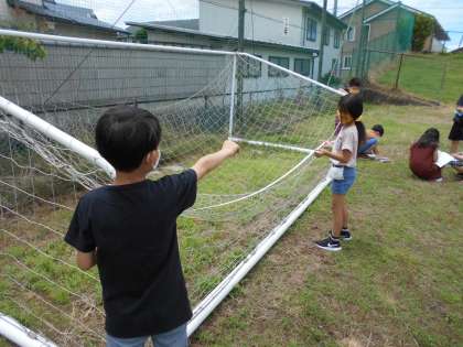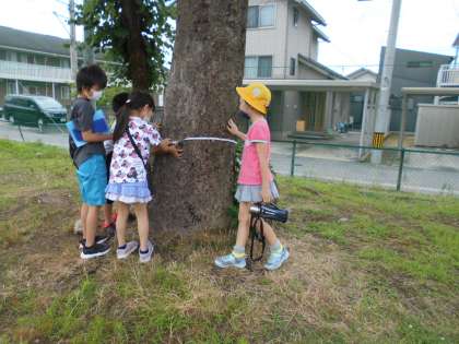 今日の算数では、巻き尺を使って、グラウンドの木やサッカーゴールの長さを測りました。「0のところを合わせて目盛りを読むよ」などと声かけ合って活動しました。